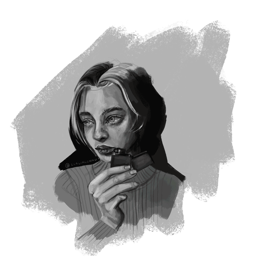 This digital artwork features a young woman rendered in a painterly, semi-realistic style, holding a lit lighter close to her face. Her gaze is contemplative, directed off-frame, suggesting introspection or quiet intensity. The background consists of broad, textured gray brushstrokes that frame the figure without overpowering it, emphasizing the subject’s expression and gesture. The muted palette and soft lighting evoke a sense of nostalgia and emotional depth, aligning with the project’s theme of visual storytelling through light and color.